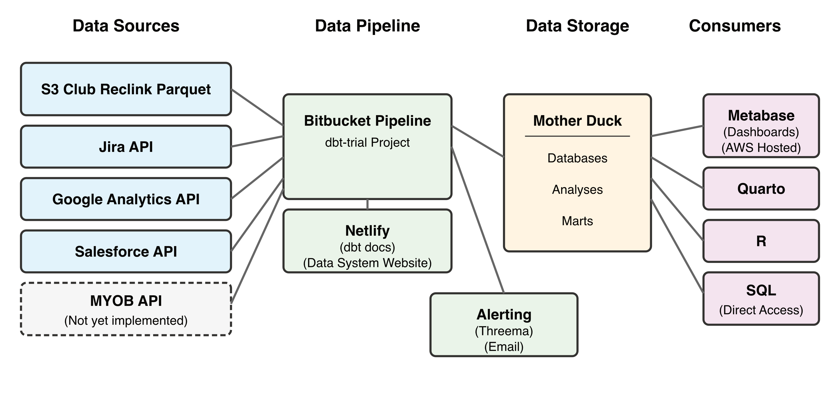 Data in our organisation flows through a series of steps, as shown in the diagram. Here’s what each component does: